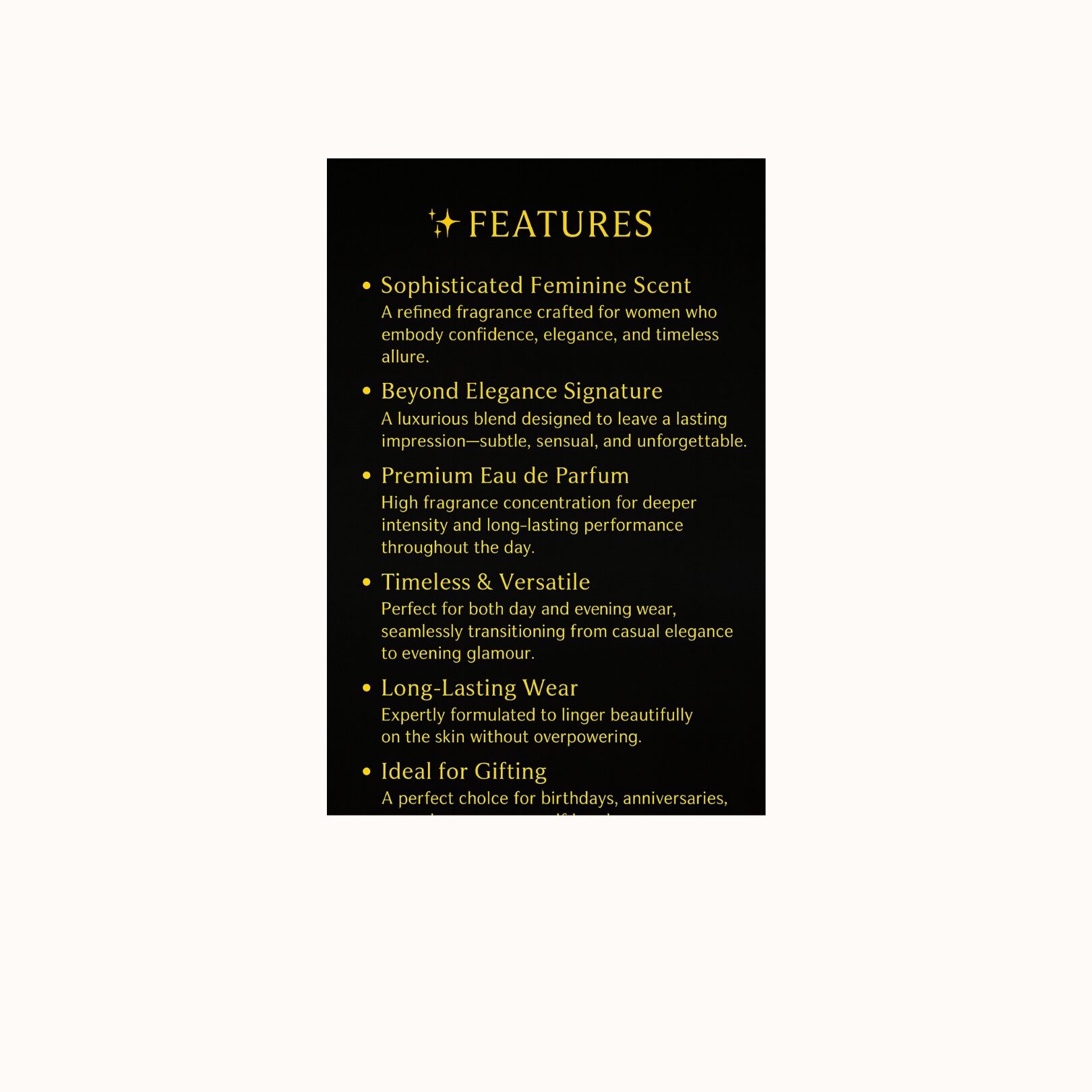 For the confident, glamorous woman who wants a signature scent that demands attention, this Eau de Parfum is a must-have. Spray on pulses and neck for an unforgettable entrance. Equally important is that this fragrance empowers you to reveal your most alluring, sensual side.